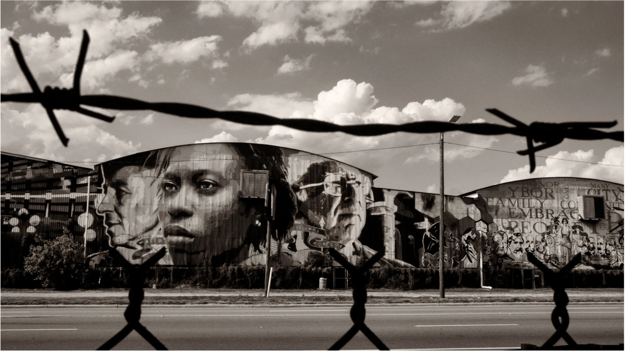 Photographer Lily Evans, has captured without Photoshop techniques, a different point of view that raises both questions and concerns. The mural is on one side of the street and the barbed wire fence is on the other side where the sharp barbs obstruct the view. Has the History been detained, incarcerated, distanced, triggering a rewrite? Why?_To what end? Who is leading this false history movement?